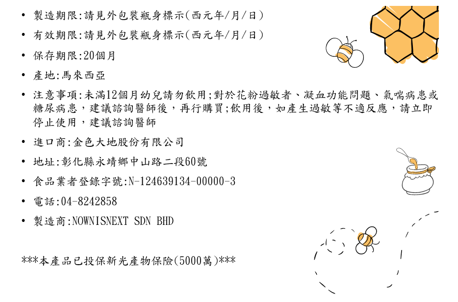 【注意事項】蜂蜜隨著時間和溫度的變化,有可能會逐漸轉變為黏稠或結晶,此為自然現象,請放心飲用
