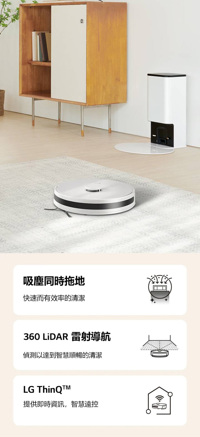LG ThinQ 遠端遙控清掃、即時監控 將產品添加到 LG ThinQ,以使用 LG ThinQ 應用程式為您的家居空間量身訂製更智慧的方式來清潔。