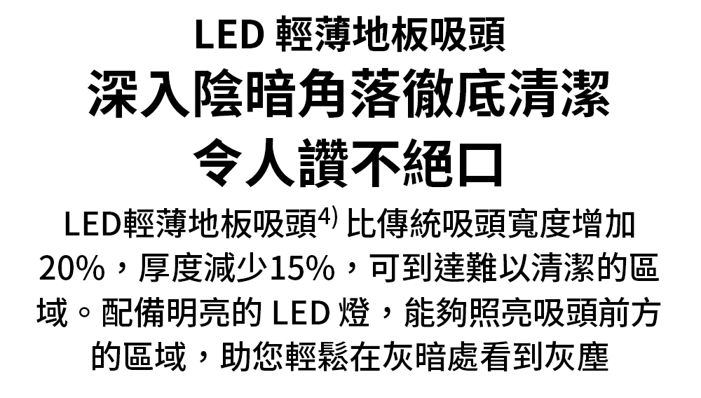 - 此為 LG 的測量結果,與現有的 LG CordZero™ A9 無線吸塵器的地板吸頭進行比較。