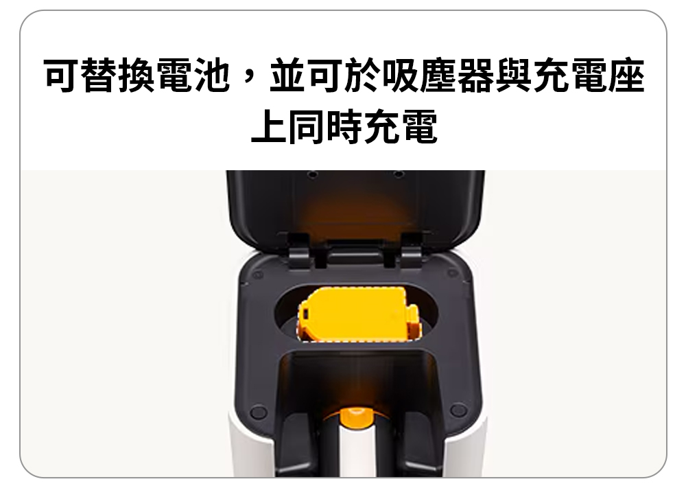 6) 可替換電池,並可於吸塵器與充電座上充電。本機型僅附1顆電池。