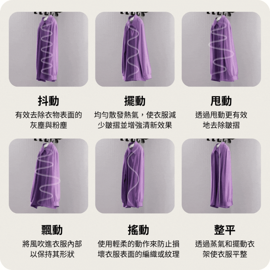 A.Styler 的運行過程如下:蒸氣準備 → 預熱 → 清新(蒸氣應用 + 溫度維持) → 乾燥(乾燥準備 + 乾燥)。 可移動衣架在清新過程中的蒸氣應用到溫度維持階段運行,每個程序有不同的運行時間和轉速(RPM)。除了殺菌和寢具行程外,智慧擺動衣架會在所有行程中皆會擺動,若有不合適的衣服或物品,建議可放置於層架上。