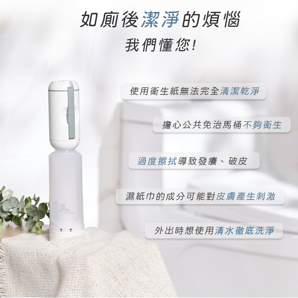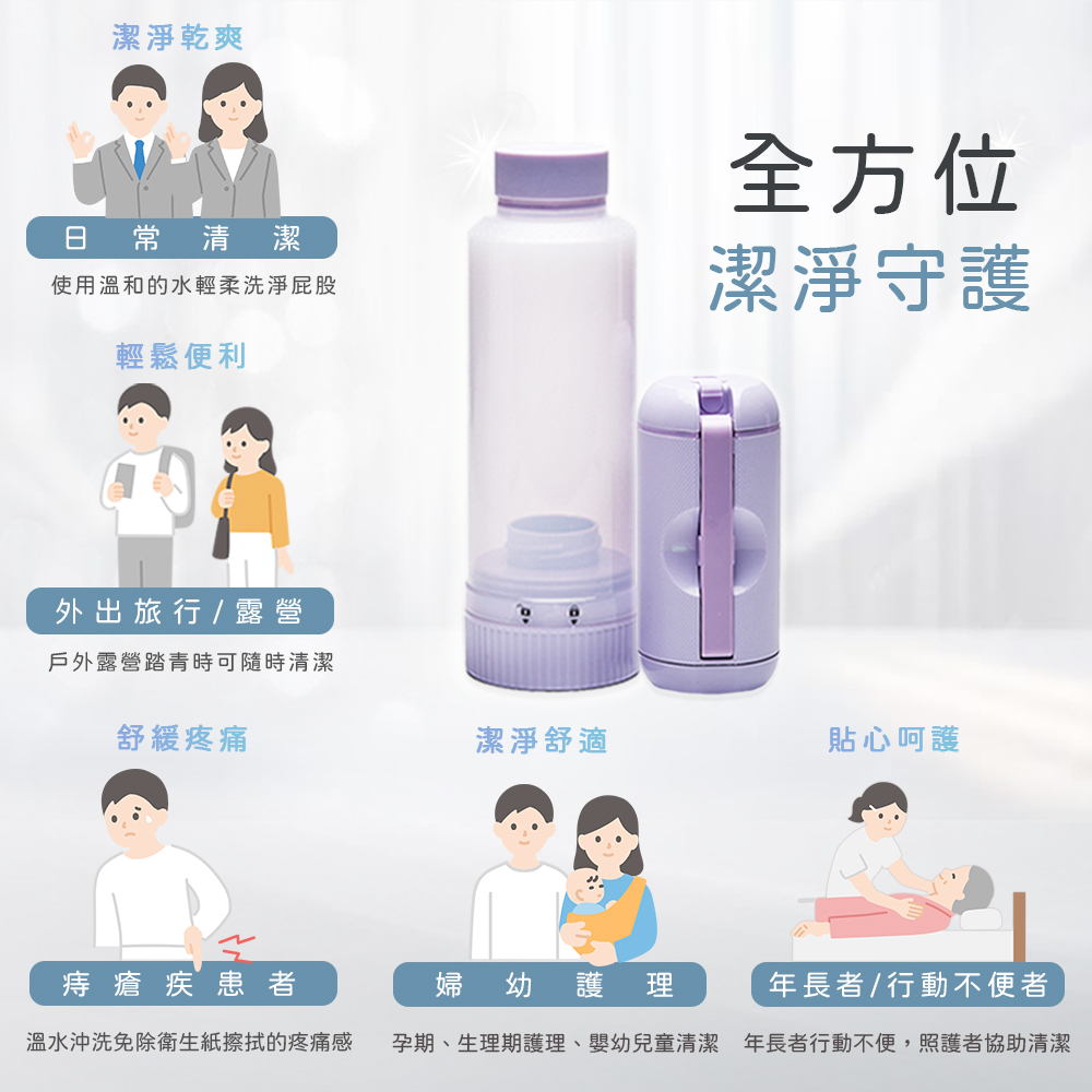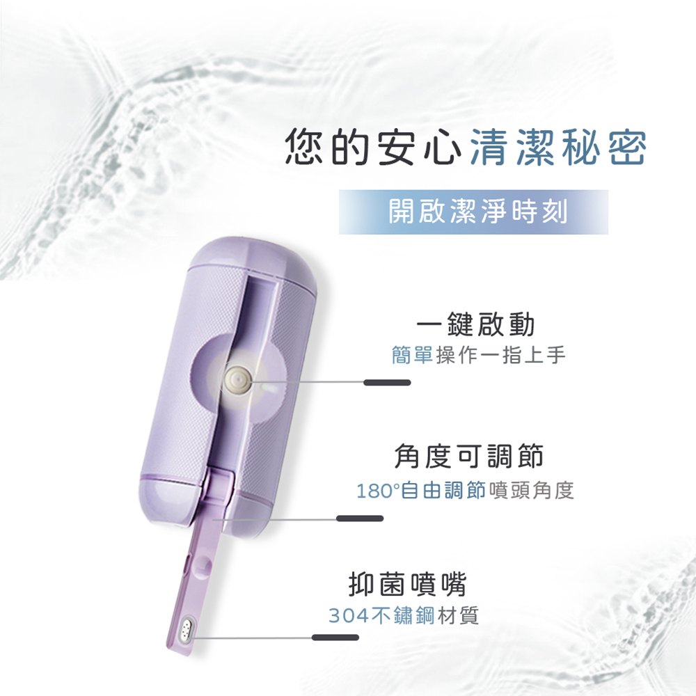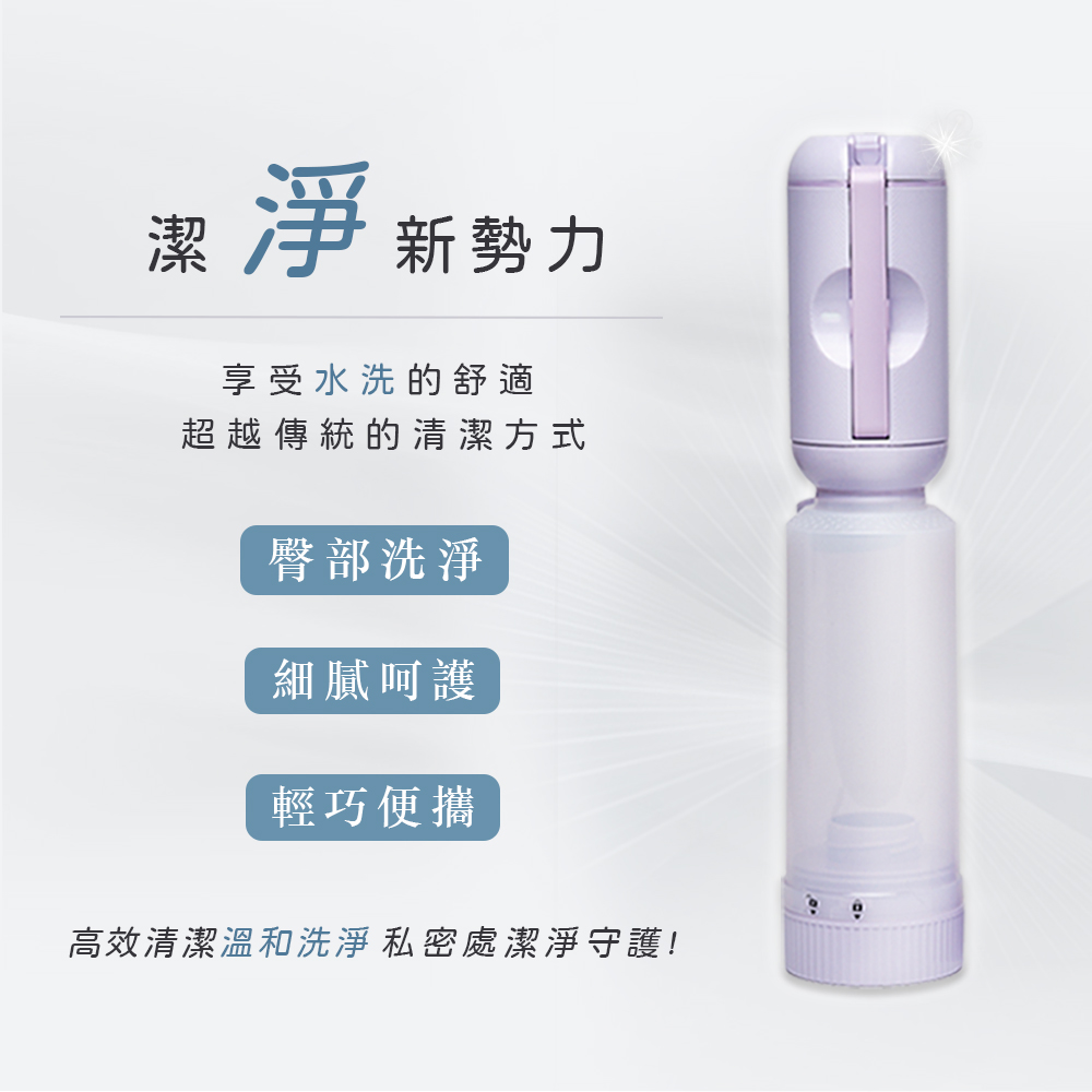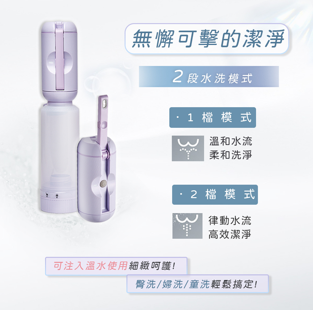 「便攜式沖洗器,配有180度可調噴頭、2段水流設計,輕巧隨身攜帶,全方位潔淨,滿足多元清潔需求,隨時享受專業潔淨,提升生活品質。」