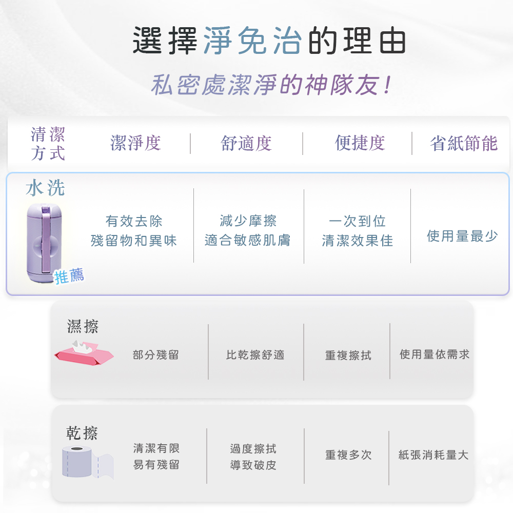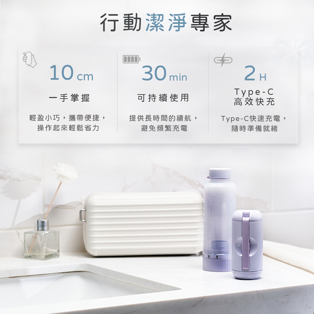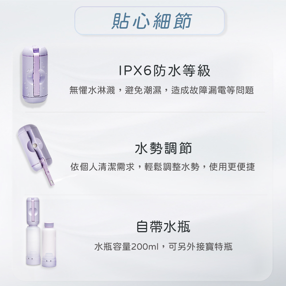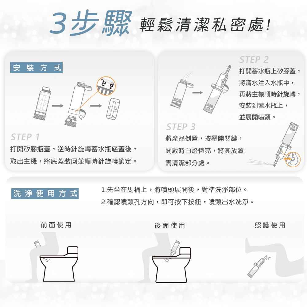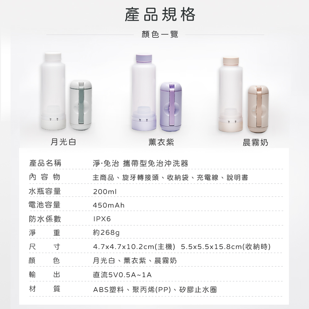 「便攜式沖洗器,配有180度可調噴頭、2段水流設計,輕巧隨身攜帶,全方位潔淨,滿足多元清潔需求,隨時享受專業潔淨,提升生活品質。」