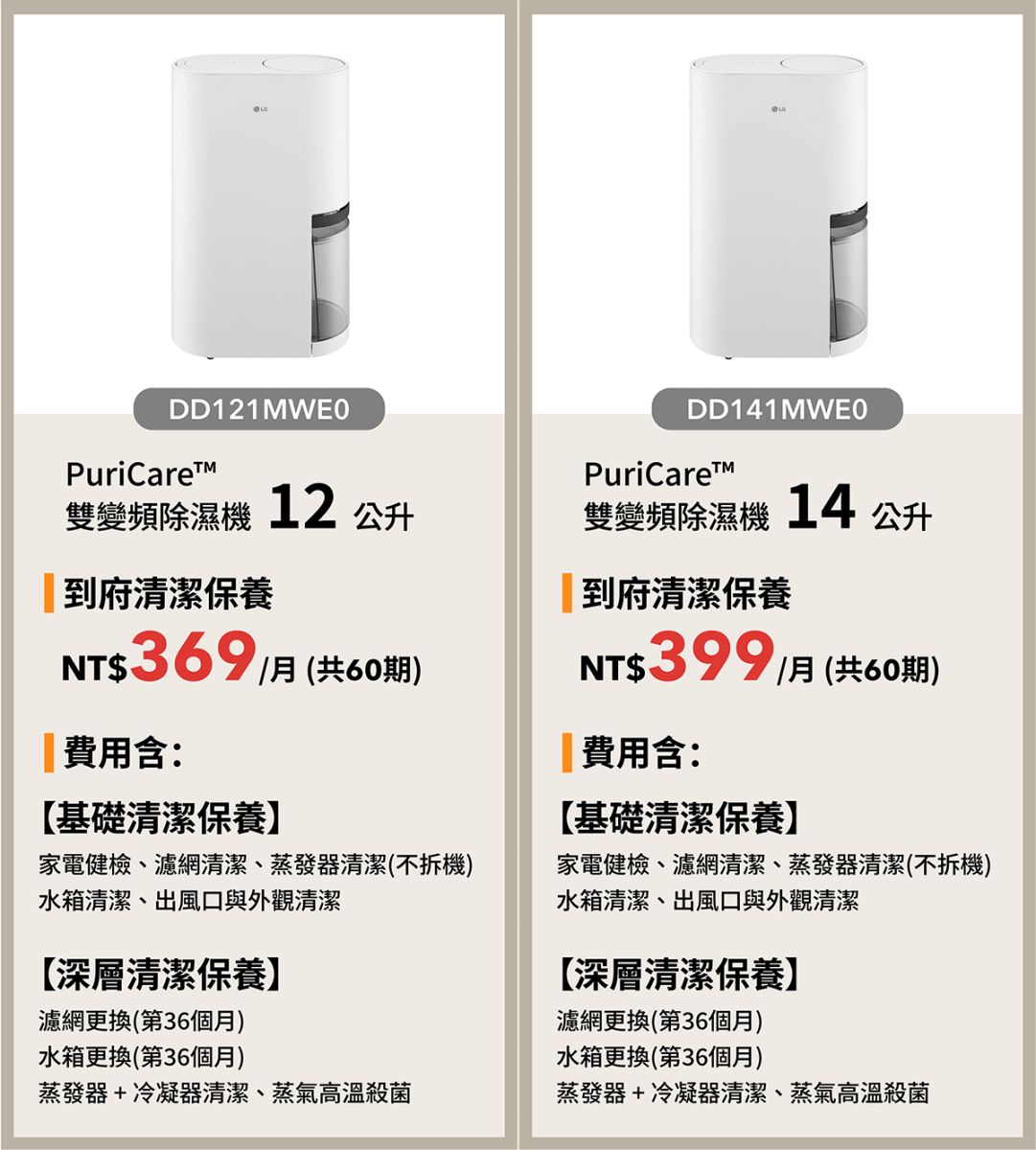 DD121MWE0 | 369 | 5年/共60期 | 到府清潔保養 | 基礎清潔:第1,2,4,5年 深層清潔:第3年 |