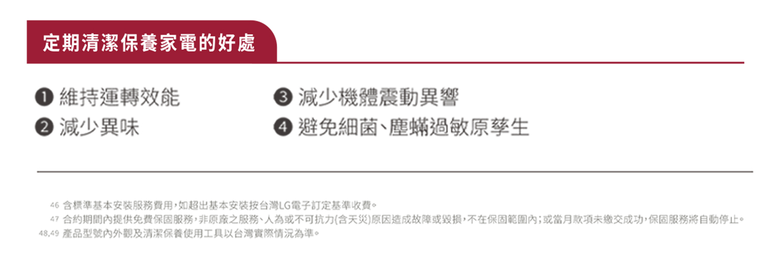 | 1,390 | 加強到府清潔保養 | 基礎清潔:第1,3,5,7年 深層清潔:第2,4,6年 |