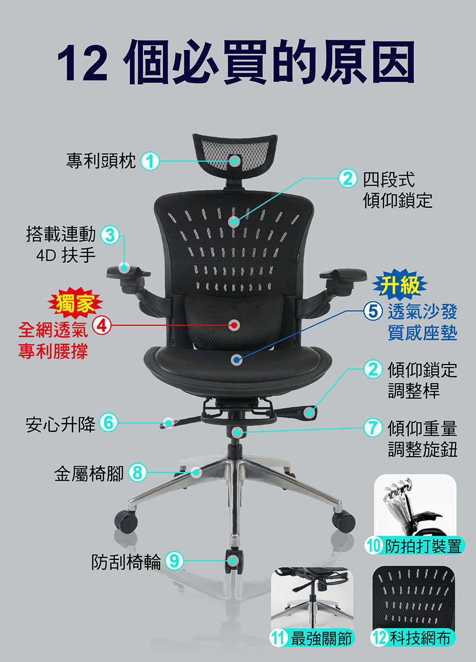 全球首創多元廣角可調式腰撐系統,全網更透氣,腰枕加厚更貼身,除了柔軟彈性外,專利自動回彈裝置,兼顧腰部所需支撐力,在不知不覺中,完美升級的乘坐體驗!