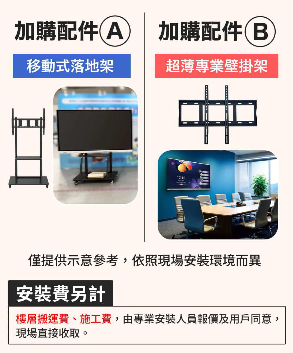 | 安裝方式 | 壁掛式/落地支架 |