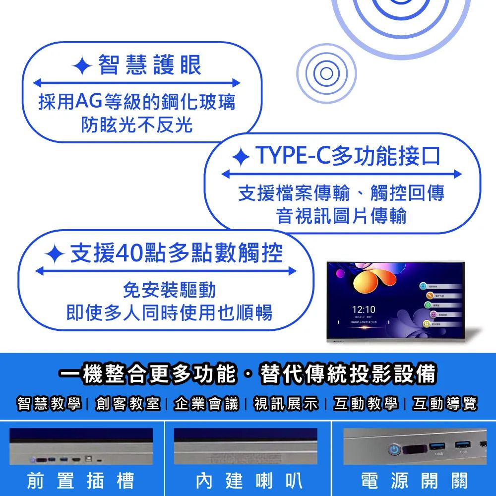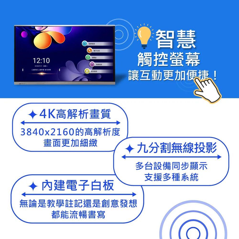 | 觸控方式 | 手指、觸控筆、非尖銳棒狀物體 / 可使用螢幕觸控選單,點選無需遙控器 |