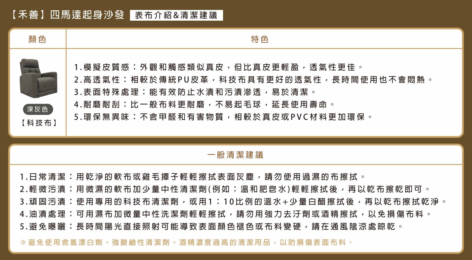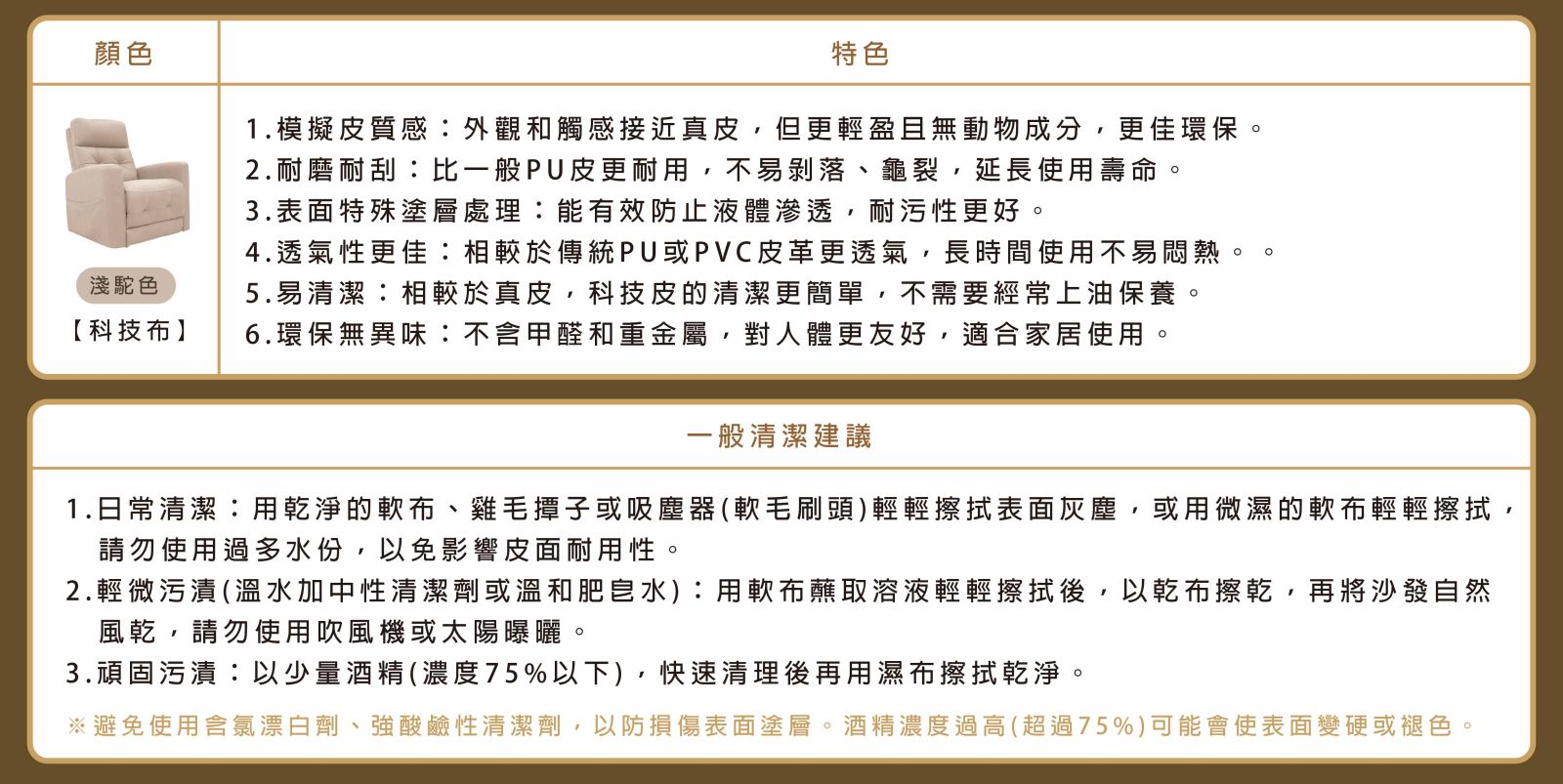※避免使用含氯漂白劑、強酸鹼性清潔劑、酒精濃度過高的清潔用品,以防損傷表面布料。