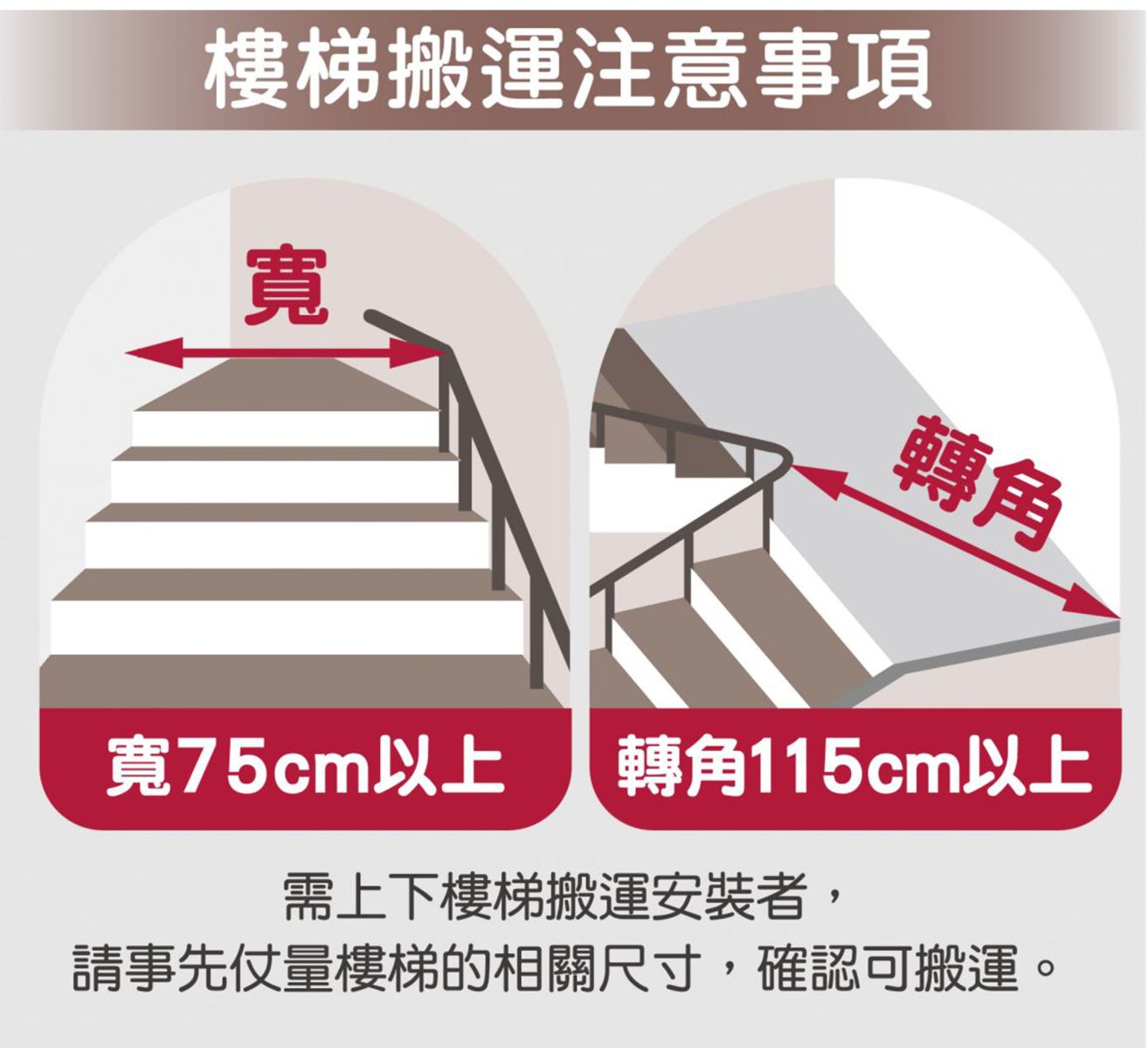 ※門寬及搬運過程所過通道,含箱搬運至少要75公分以上,樓梯迴轉半徑至少需115公分以上;裸機搬運至少要70公分以上,樓梯迴轉半徑至少需105公分以上。